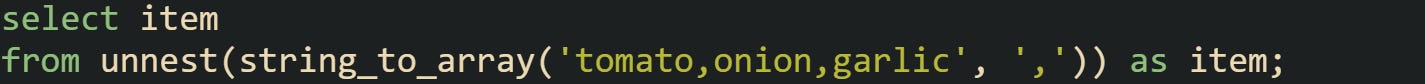 ![select jt.val from json_table( concat('["', replace('a,b,c', ',', '","'), '"]'), '$[*]' columns (val varchar(30) path '$') ) as jt; select jt.val from json_table( concat('["', replace('a,b,c', ',', '","'), '"]'), '$[*]' columns (val varchar(30) path '$') ) as jt;](https://substackcdn.com/image/fetch/$s_!Bh42!,w_1456,c_limit,f_auto,q_auto:good,fl_progressive:steep/https%3A%2F%2Fsubstack-post-media.s3.amazonaws.com%2Fpublic%2Fimages%2F9f585200-d2f1-4cca-8c54-f5ad2584b838_1496x212.png)