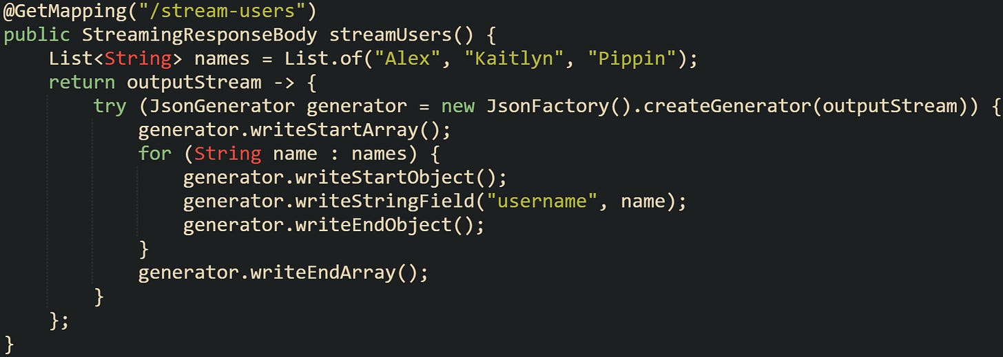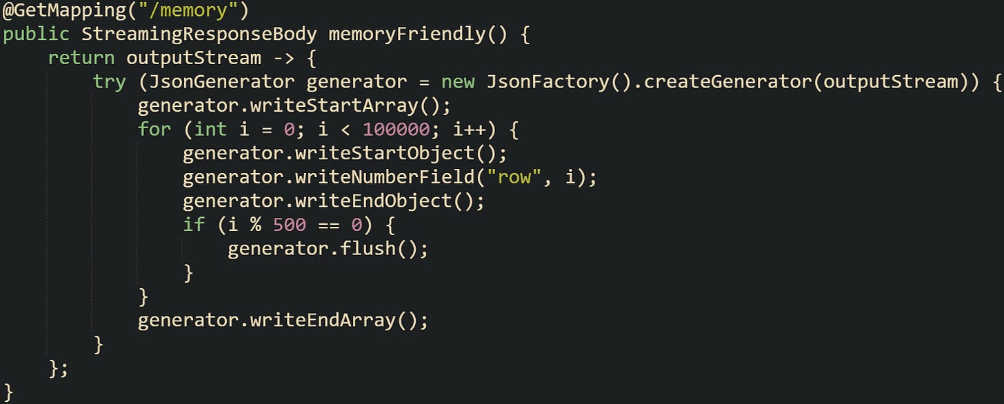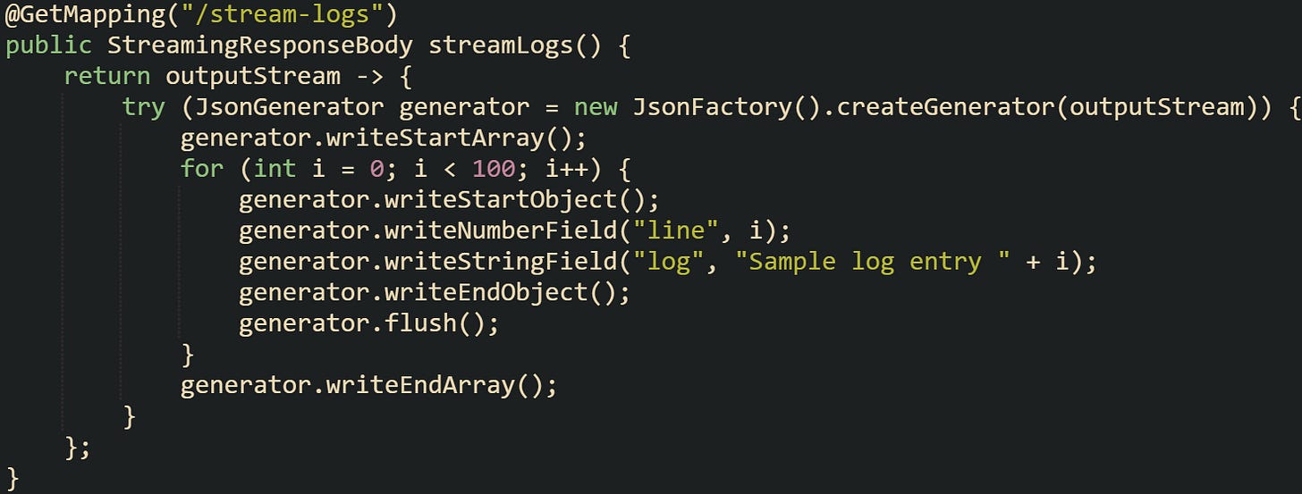 is the most direct way to stream JSON in a Spring Boot application. It accepts a lambda or functional interface that writes bytes to the HTTP response. Inside that block, you can use Jackson’s JsonGenerator