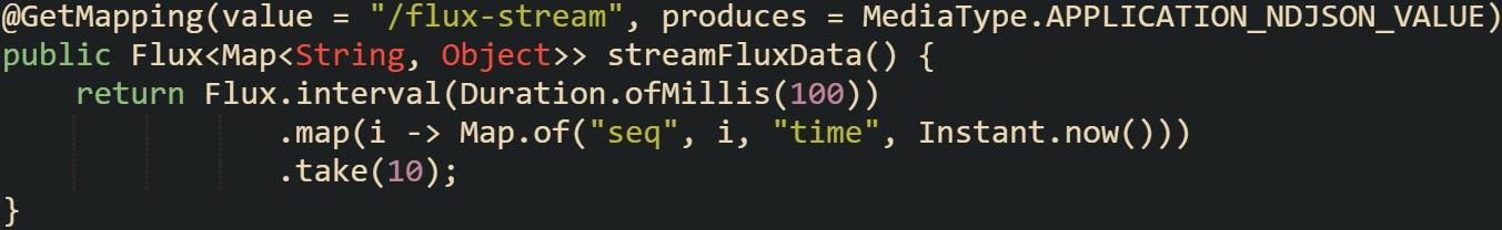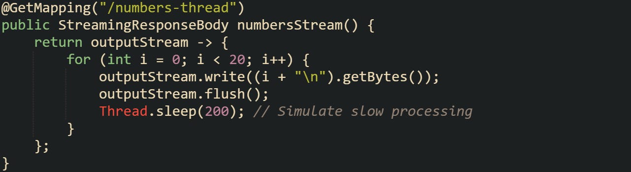 Streaming changes the flow by writing directly to the servlet response output stream. Instead of waiting for a complete object graph, JSON elements are written one by one, and the client can start receiving data almost immediately. Spring Boot makes this possible with the StreamingResponseBody
