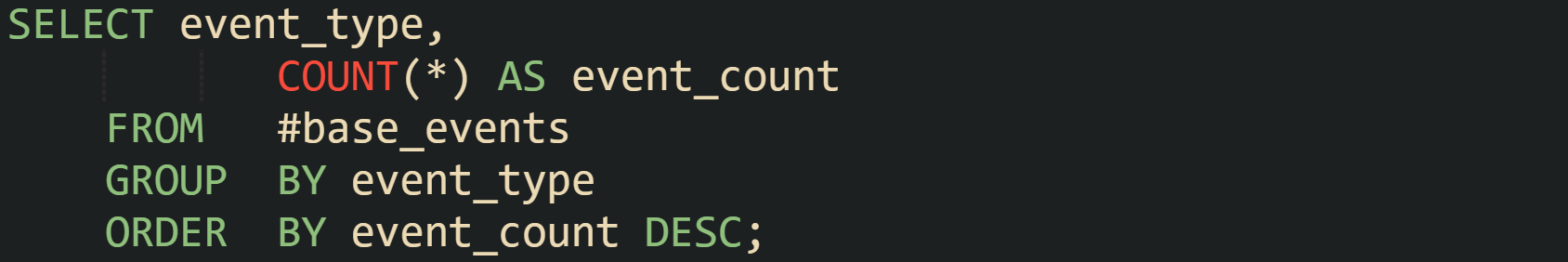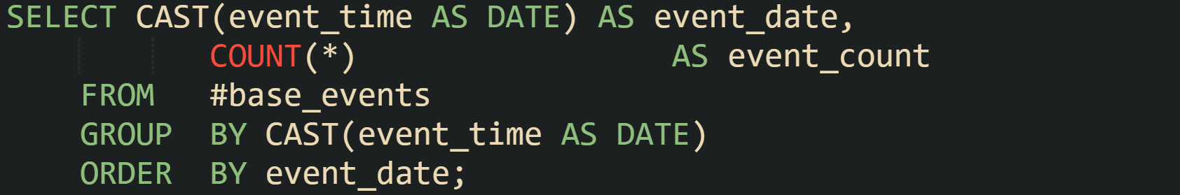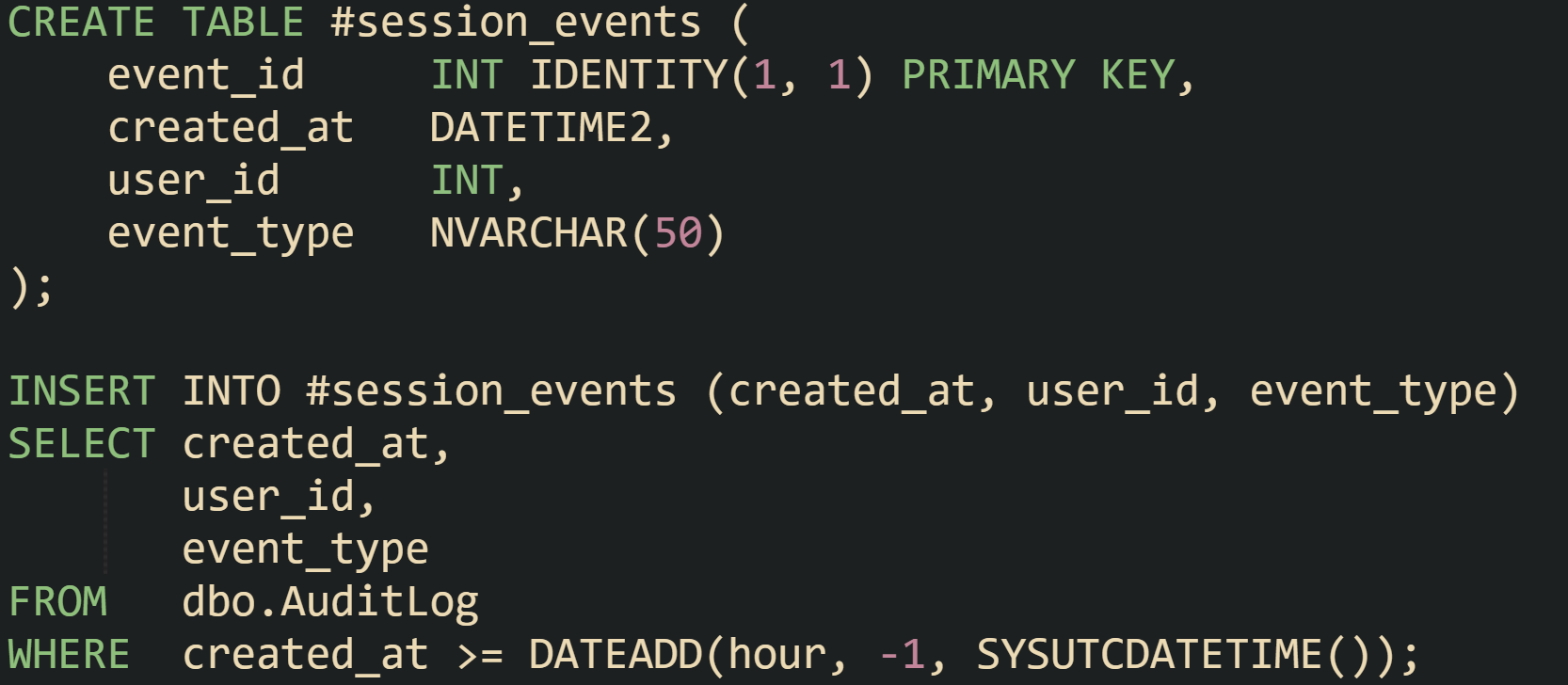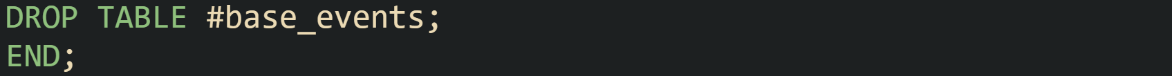 The temporary table #base_events now carries only the rows relevant to that customer and date window. Any later query inside the procedure can reference it without repeating the filters on AuditLog.