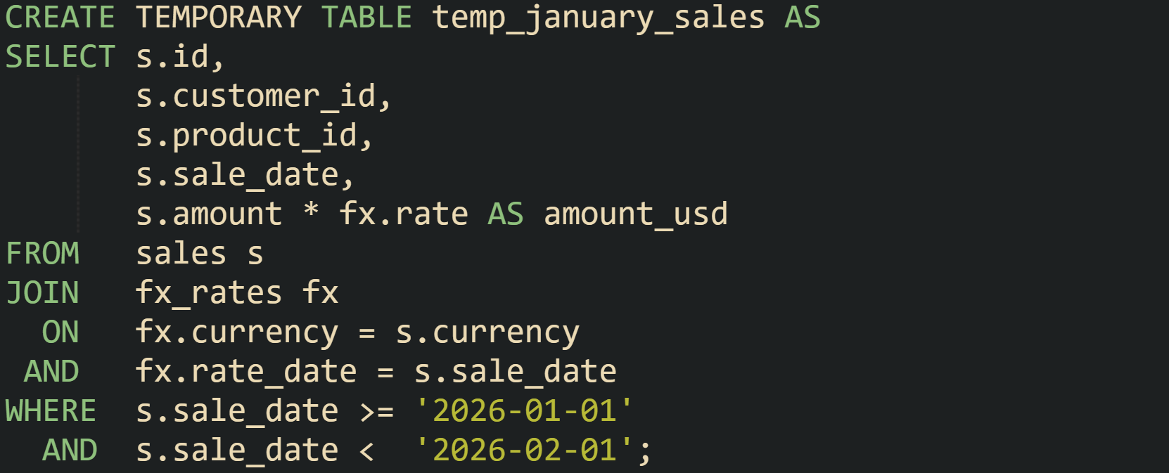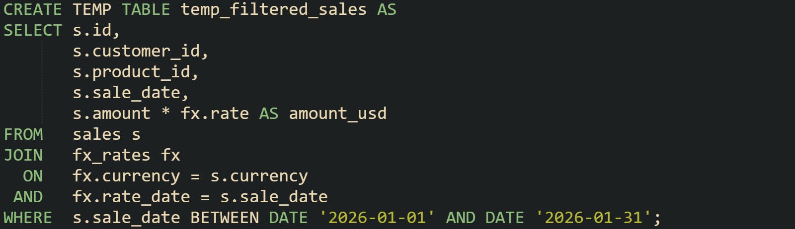 This temporary table now holds only the rows and columns needed for the report, with values already converted to a single currency. Later steps no longer need to repeat conversion logic or scan dates outside that window.