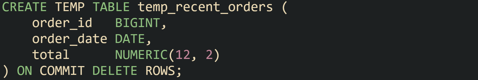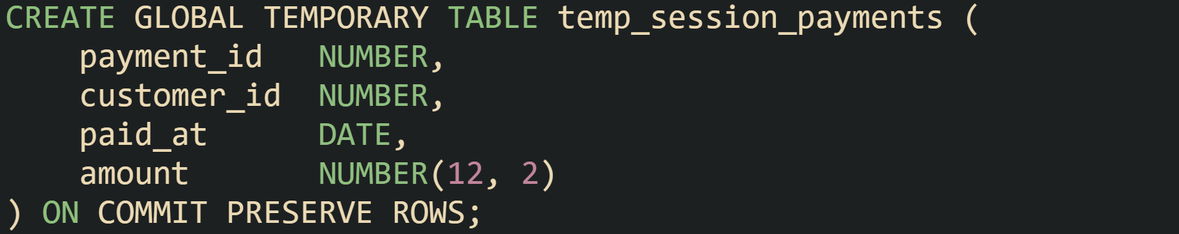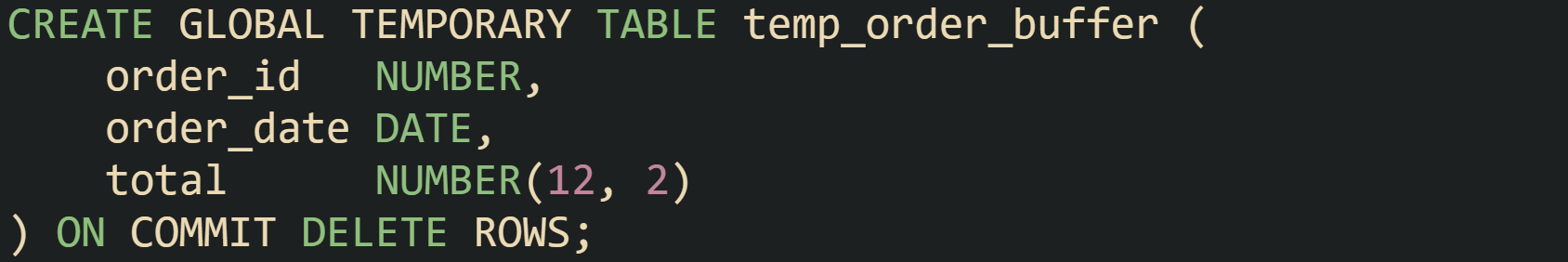 Oracle exposes global temporary tables, which work a bit differently. The table definition is permanent and stored in the data dictionary, so any session can reference the table by name. Data itself is still temporary, and each session sees only its own rows. The ON COMMIT clause controls when those rows go away. Typical usage looks like this: