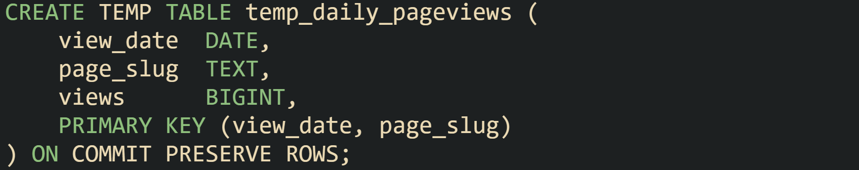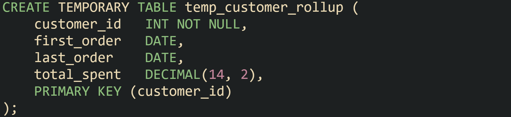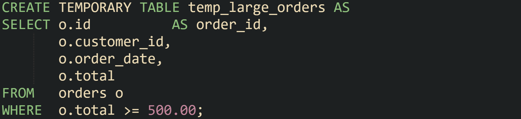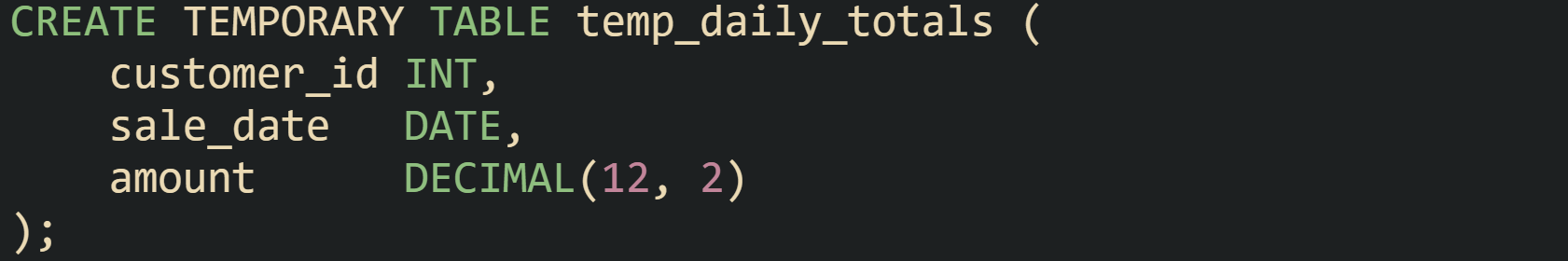 MySQL uses the TEMPORARY keyword. The table definition can be written from scratch, or a query can feed the definition through CREATE TEMPORARY TABLE AS SELECT. Both styles appear in production code, and the choice comes down to how much control is needed over column types and indexes. Direct table definitions often look like this: