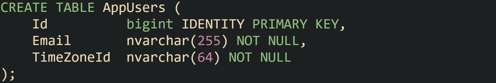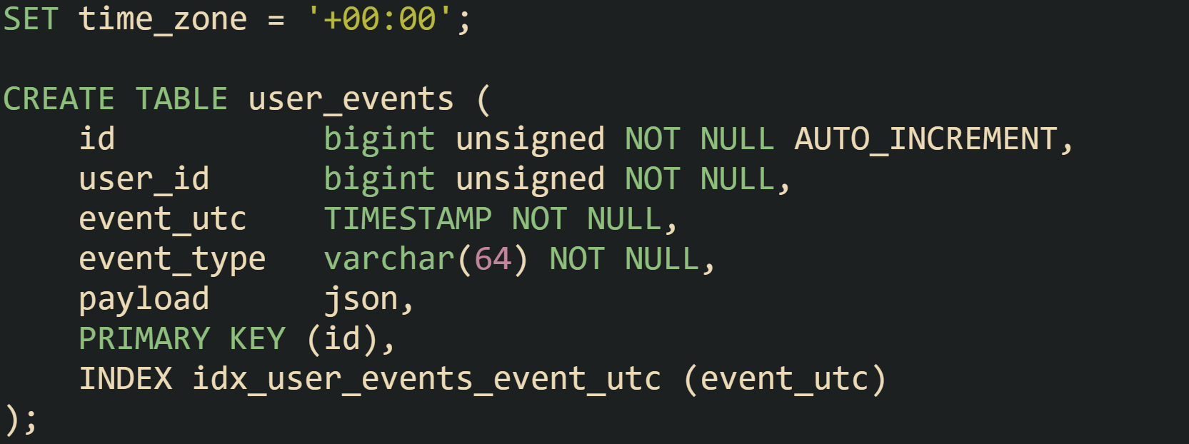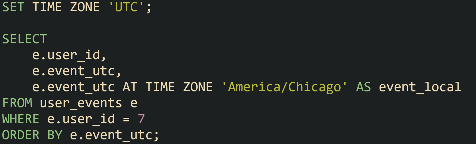 This design allows Kaitlyn in one zone and Pippin in another to share the same user_events table. Each person sees times aligned with their own region, while the stored data stays on a single UTC scale.