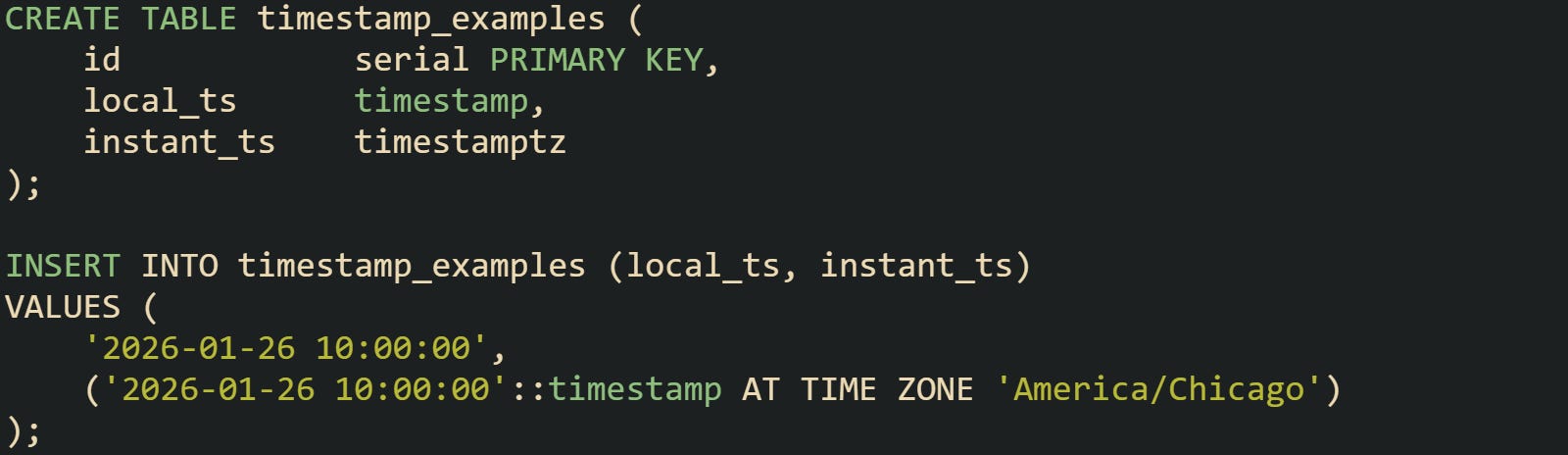 After running this insert from a session set to UTC, a query that selects both columns will reveal that local_ts keeps the literal calendar value, while instant_ts shows the same instant adjusted for session time zone rules. That contrast hints at why a timestamptz column works better for cross-region work.