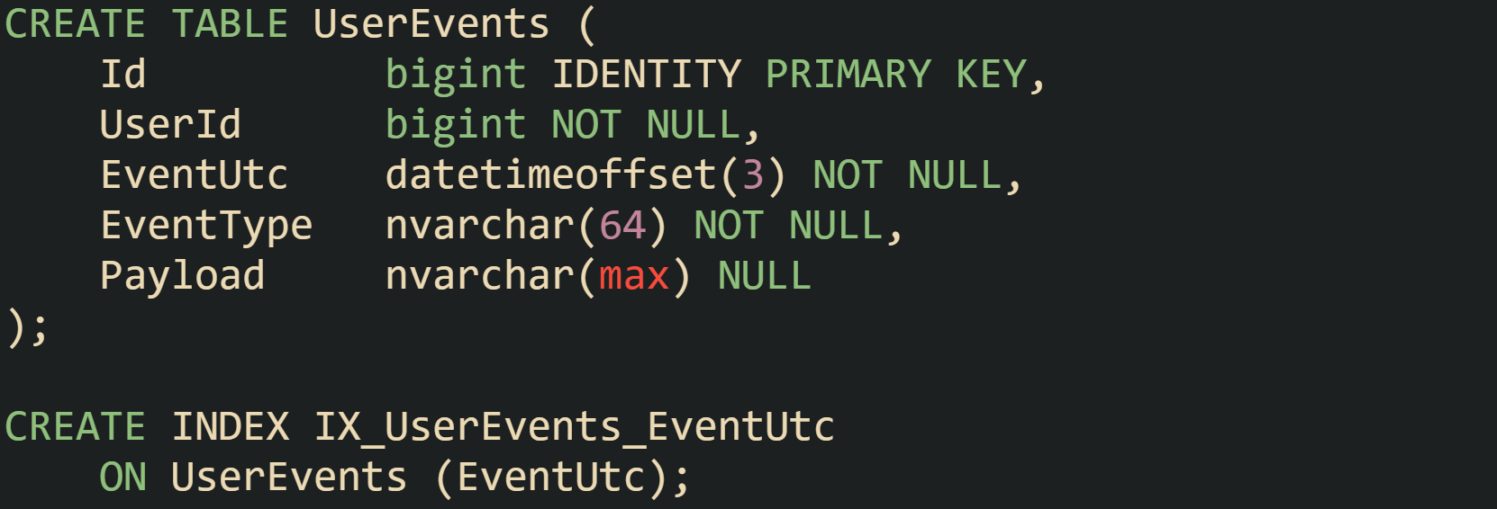 The AuditEvents table stores EventUtc as datetimeoffset with offset zero. StartUtc and EndUtc now represent precise instants, even on complex days with clock changes. The filter then works with those instants and avoids reasoning in local time until data is rendered for a report.