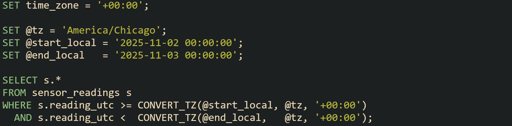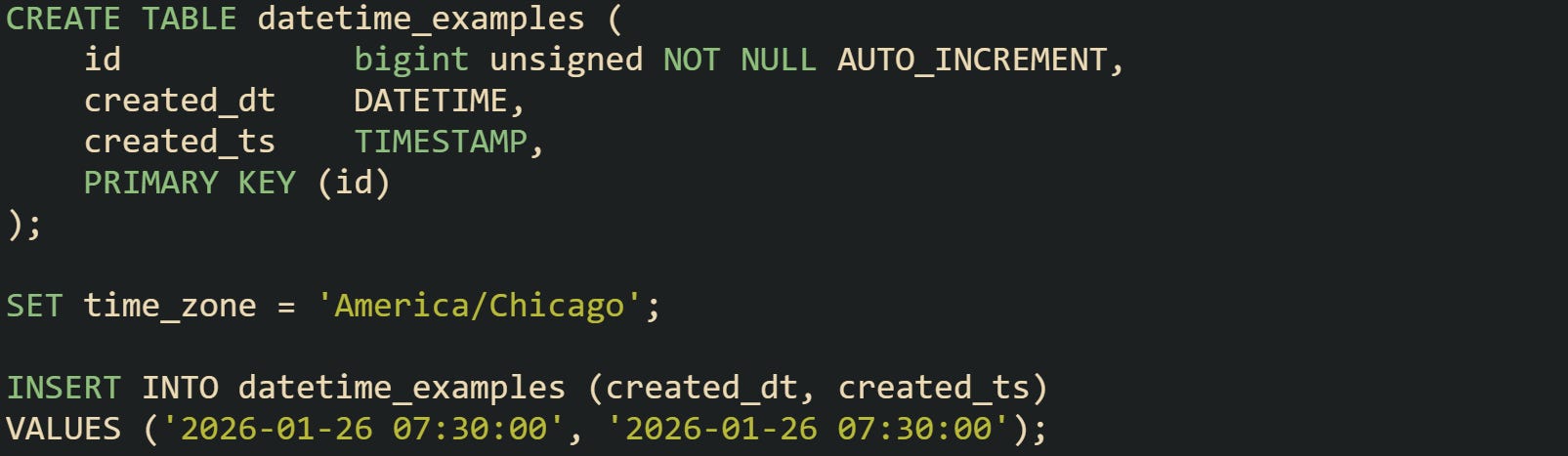 Subsequent reads with time_zone = '+00:00' will show created_dt as the original local value and created_ts as the corresponding UTC time. That difference matters once rows come from multiple regions or once queries compare timestamps across large ranges.