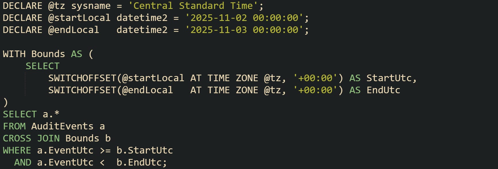 SQL Server uses datetime2 and datetimeoffset for a similar style of filter. Queries that select audit events for a local window first turn local boundaries into datetimeoffset instants for a region such as central time: