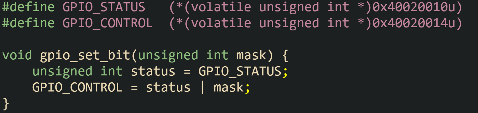 The definition of GPIO_STATUS and GPIO_CONTROL uses pointers to volatile data cast from fixed addresses, then dereferences them to create lvalue expressions. The read from GPIO_STATUS must become a load from the hardware register every time the function executes, and the store to GPIO_CONTROL must become a write, even when no C code ever reads the value back.