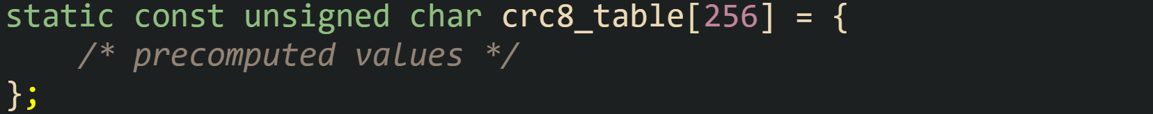 ![static const unsigned char crc8_table[256] = { /* precomputed values */ }; static const unsigned char crc8_table[256] = { /* precomputed values */ };](https://substackcdn.com/image/fetch/$s_!4C8n!,w_1456,c_limit,f_auto,q_auto:good,fl_progressive:steep/https%3A%2F%2Fsubstack-post-media.s3.amazonaws.com%2Fpublic%2Fimages%2Fe0680fe9-995e-480c-9376-9a55e5e793db_1656x164.png)