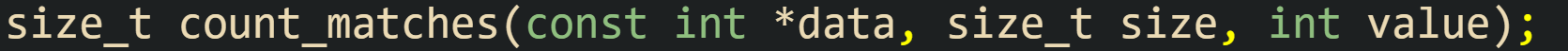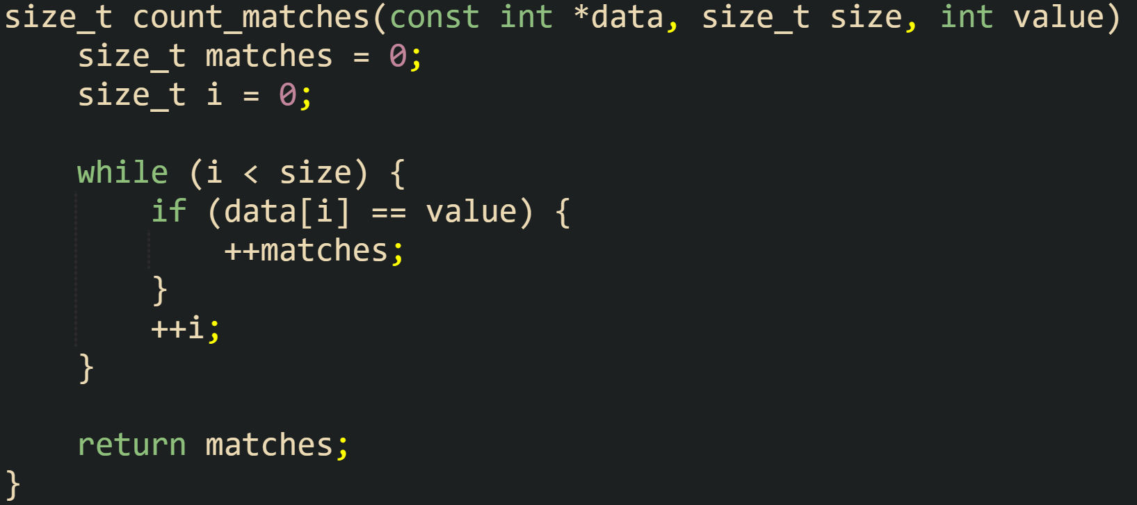 ![size_t count_matches(const int *data, size_t size, int value) { size_t matches = 0; size_t i = 0; while (i < size) { if (data[i] == value) { ++matches; } ++i; } return matches; } size_t count_matches(const int *data, size_t size, int value) { size_t matches = 0; size_t i = 0; while (i < size) { if (data[i] == value) { ++matches; } ++i; } return matches; }](https://substackcdn.com/image/fetch/$s_!WOol!,w_1456,c_limit,f_auto,q_auto:good,fl_progressive:steep/https%3A%2F%2Fsubstack-post-media.s3.amazonaws.com%2Fpublic%2Fimages%2Fc7579bea-28f1-45df-ae0b-2500d22c76d1_1635x727.png)