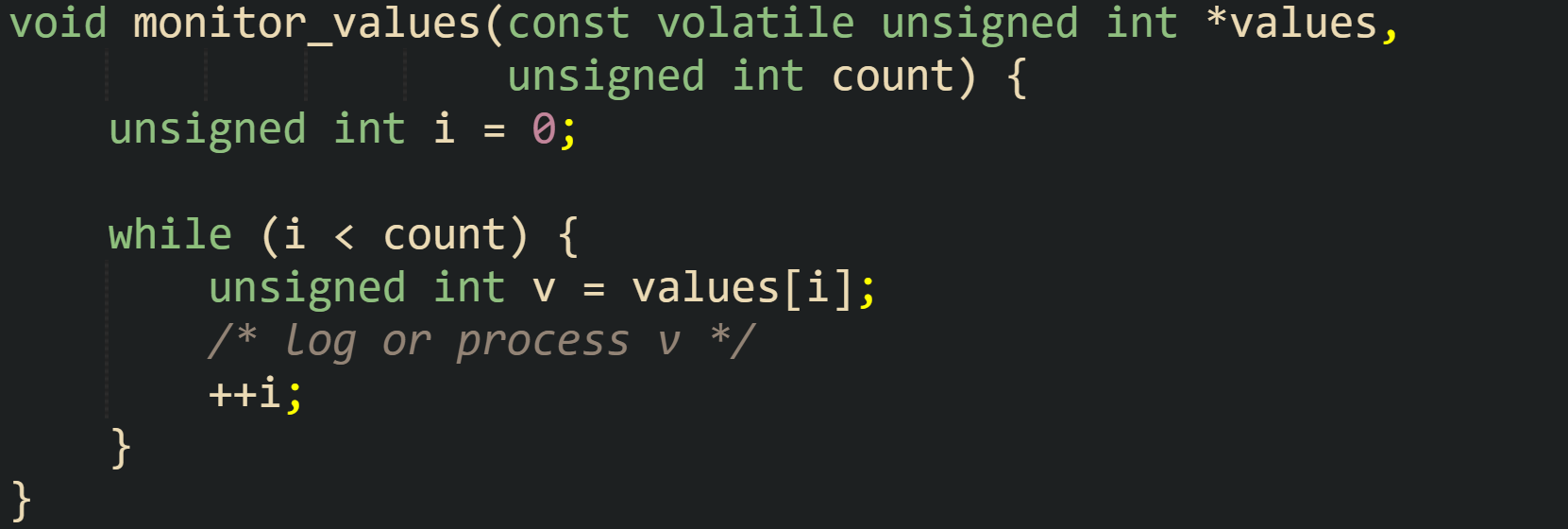 ![void monitor_values(const volatile unsigned int *values, unsigned int count) { unsigned int i = 0; while (i < count) { unsigned int v = values[i]; /* log or process v */ ++i; } } void monitor_values(const volatile unsigned int *values, unsigned int count) { unsigned int i = 0; while (i < count) { unsigned int v = values[i]; /* log or process v */ ++i; } }](https://substackcdn.com/image/fetch/$s_!KNAQ!,w_1456,c_limit,f_auto,q_auto:good,fl_progressive:steep/https%3A%2F%2Fsubstack-post-media.s3.amazonaws.com%2Fpublic%2Fimages%2Fb6e375b1-f607-4549-b90b-63f424a30085_1661x560.png)