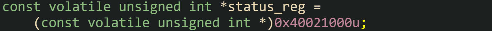 Read-only status registers are natural candidates for const volatile. Some devices expose a status word that software polls, but that software never sets bits in that word. Writes either have no effect or are not permitted by the hardware interface.