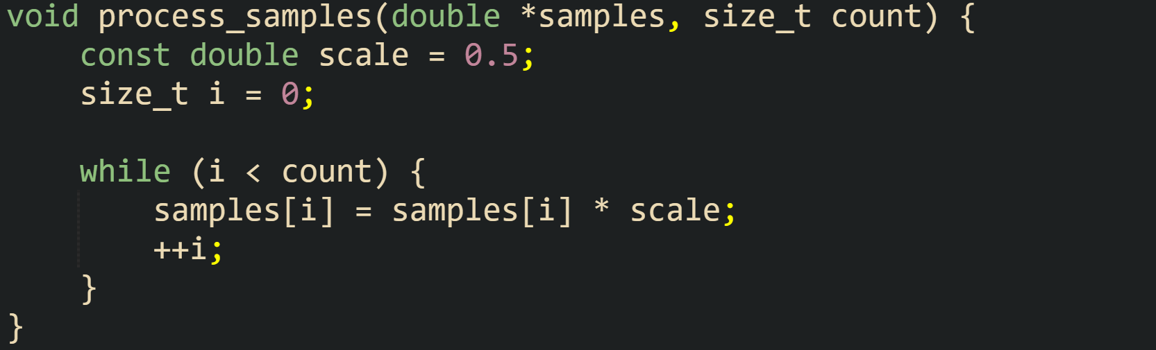 ![void process_samples(double *samples, size_t count) { const double scale = 0.5; size_t i = 0; while (i < count) { samples[i] = samples[i] * scale; ++i; } } void process_samples(double *samples, size_t count) { const double scale = 0.5; size_t i = 0; while (i < count) { samples[i] = samples[i] * scale; ++i; } }](https://substackcdn.com/image/fetch/$s_!M8zY!,w_1456,c_limit,f_auto,q_auto:good,fl_progressive:steep/https%3A%2F%2Fsubstack-post-media.s3.amazonaws.com%2Fpublic%2Fimages%2F5dd54482-b7f4-491f-9d14-657f455b3129_1665x505.png)