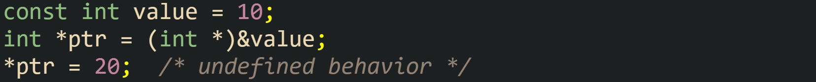 Undefined behavior enters the picture when code removes const from a pointer type and then writes through it to an object that was originally defined as const. In that case the rules treat the object as read only, so the store is not covered by the standard even if it appears to work on a given build. The generated code may still perform the write on some runs, yet the compiler is free to rely on the const qualifier for optimization in ways that break that code.