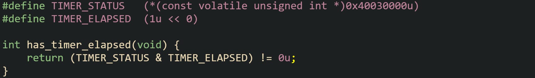 The access to TIMER_STATUS must always hit the hardware register, yet the code treats the register as read only. Combining const with volatile states both facts in the type system.