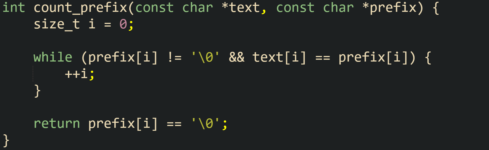 ![int count_prefix(const char *text, const char *prefix) { size_t i = 0; while (prefix[i] != '\0' && text[i] == prefix[i]) { ++i; } return prefix[i] == '\0'; } int count_prefix(const char *text, const char *prefix) { size_t i = 0; while (prefix[i] != '\0' && text[i] == prefix[i]) { ++i; } return prefix[i] == '\0'; }](https://substackcdn.com/image/fetch/$s_!zX0U!,w_1456,c_limit,f_auto,q_auto:good,fl_progressive:steep/https%3A%2F%2Fsubstack-post-media.s3.amazonaws.com%2Fpublic%2Fimages%2F126e493e-8865-4774-a357-70101c86cbfb_1650x507.png)