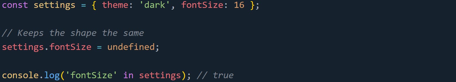 Now the options object no longer has the fontSize key at all. That’s fine for small cases, but in larger applications where consistent object shapes help performance, the difference can matter. The engine needs to handle that object differently now, because it no longer matches the previous blueprint. The undefined strategy gives you a middle ground. You still get to signal that something’s missing or inactive, but you don’t make the object harder for the engine to work with.