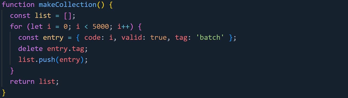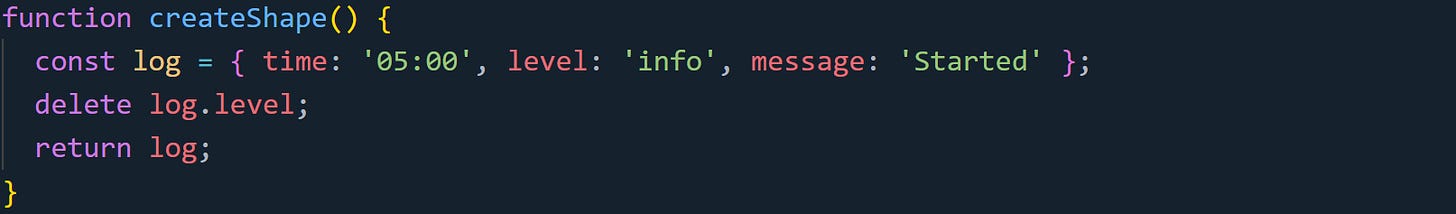 Each time this function runs, the object begins with a known shape: time, level, and message. But right after deletion, that shape breaks and the engine has to update its assumptions. If you're looping over thousands of these, the slowdown adds up, because the engine can’t rely on its cached layout anymore. The difference between an object with a clean, stable shape and one that’s had properties removed can affect how quickly your code runs, especially when those objects are part of repeated or batched operations.