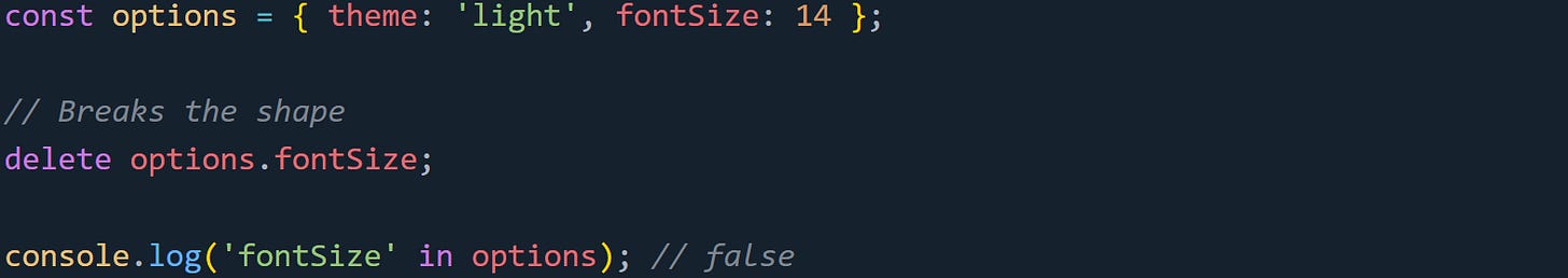JavaScript engines like V8 optimize objects using something called shapes or hidden classes. These are blueprints that describe how an object is laid out in memory. When objects share the same set of properties in the same order, they can share the same shape. That helps the engine quickly find where each property lives. When you use delete, the engine throws out the current shape and builds a new one without that property. That transition makes the object a little less predictable to the engine. It can’t reuse the same property lookup path it had before, which means property access slows down just a bit.