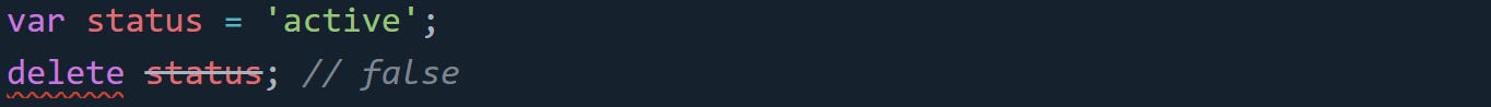 Global variables declared with var are also non-configurable. You can’t delete them, even though they live as properties on the global object.