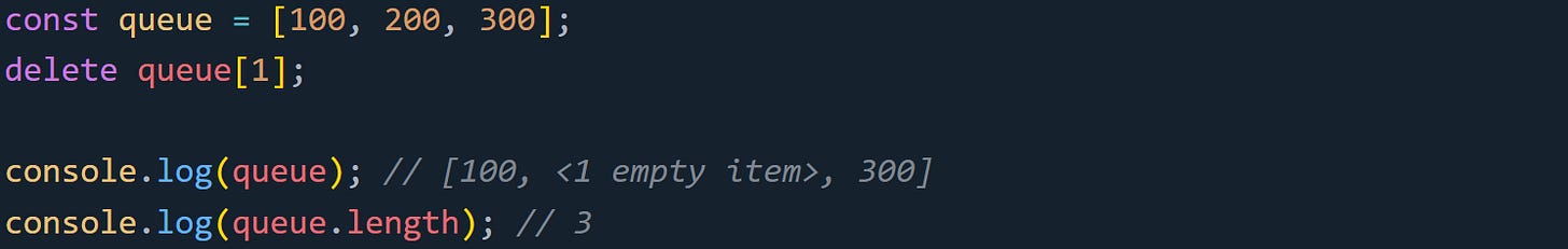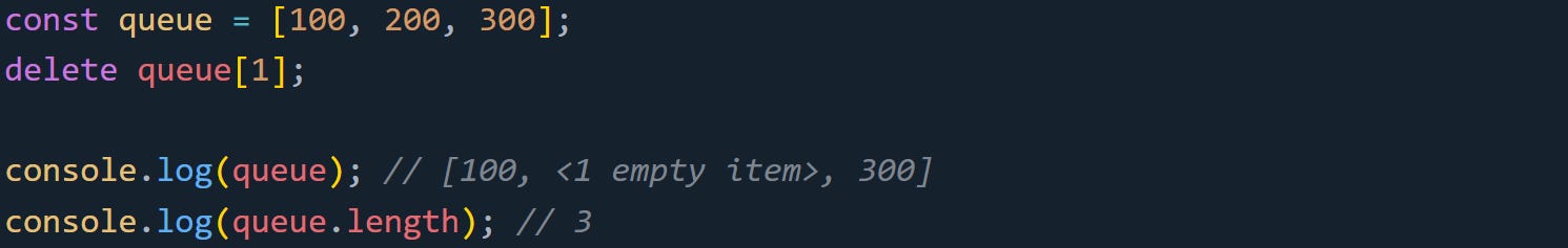 That empty slot is still part of the array, but it no longer holds a value. Methods like forEach, map, and filter skip right over it. If you're used to arrays behaving like tight packed lists, this can throw things off.
