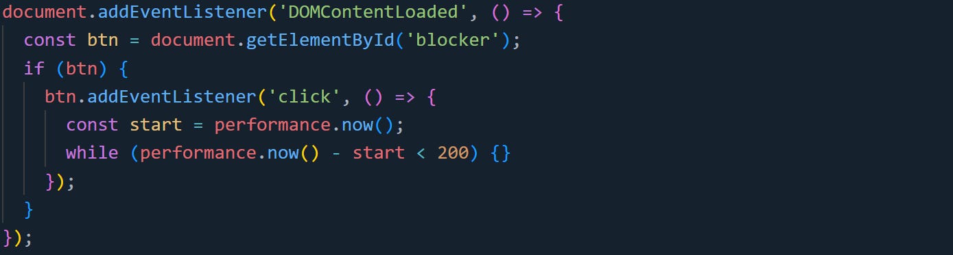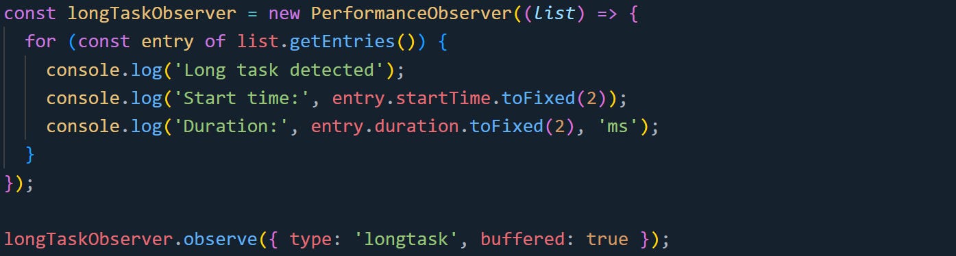 Long tasks often point to areas in your code that need to be split up or deferred. They’re a signal that too much work is happening on the main thread all at once.