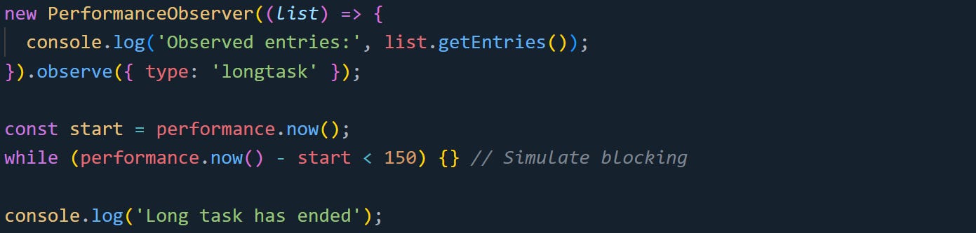The observer callback won’t fire until the loop is free. The long task blocks the thread, so the callback waits until after it ends. That’s part of how the timing system stays accurate. It measures delays without interrupting the task itself. If you’re debugging long tasks or layout shifts, the startTime and duration fields help you pinpoint the exact moment when something slowed the browser down.