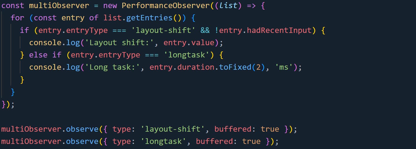 This lets you process layout shifts and long tasks in a single callback. It also helps reduce duplication when you’re collecting or logging metrics in the same place. You’re not limited to two types, you can observe as many as you need, and each type will come through with its own structure. The browser will call your callback anytime new matching entries appear.