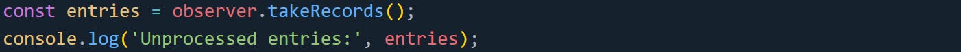 Another tool you can use is takeRecords(). It gives you any pending entries that haven't been delivered yet. It doesn't wait for the next callback cycle. This is nice if you're shutting things down and want to grab the last bit of data.