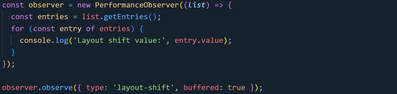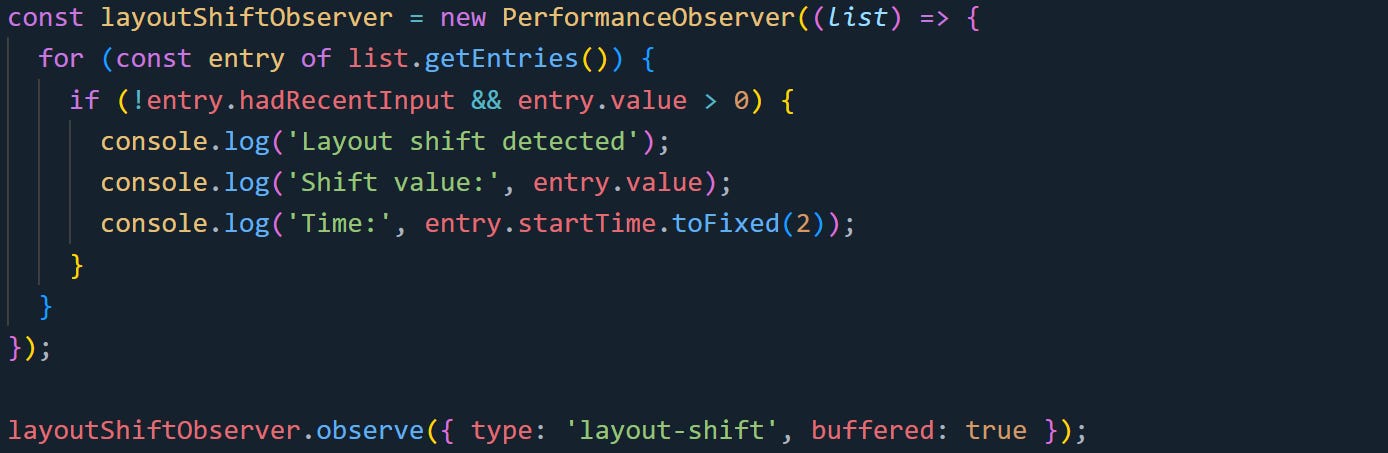 Here’s a basic observer to log layout shift values. The observer listens for a type, and the callback runs every time new entries of that type are available.