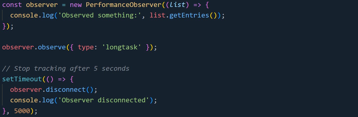 An observer stays active until you tell it to stop. This is fine for one-time measurements, but if you’re tracking performance during page interactions or inside a framework component, you’ll want to clean up when you’re done.