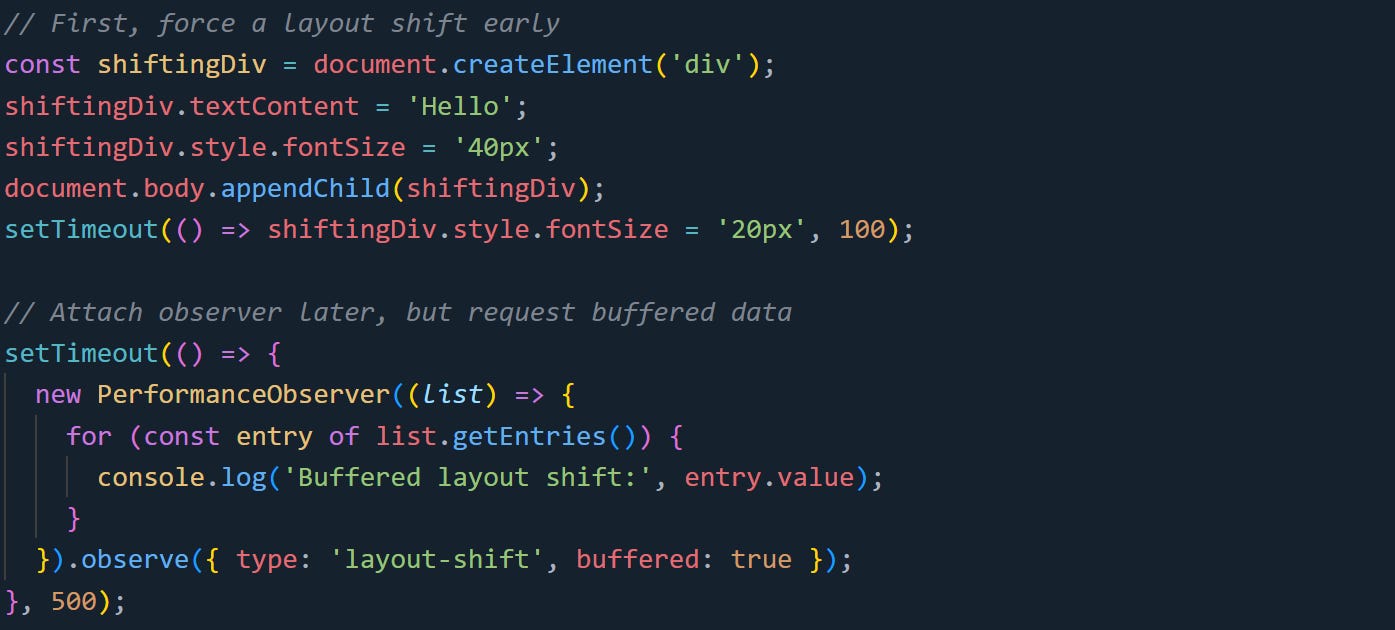The observer object watches for layout-shift events. Using buffered: true tells the browser to include any events that already happened before the observer was attached. That’s useful if your script runs a little late or waits on user input before starting. The callback gets a PerformanceObserverEntryList. Calling getEntries() returns the actual list of events that matched. Each entry will include timing and context info specific to its type.